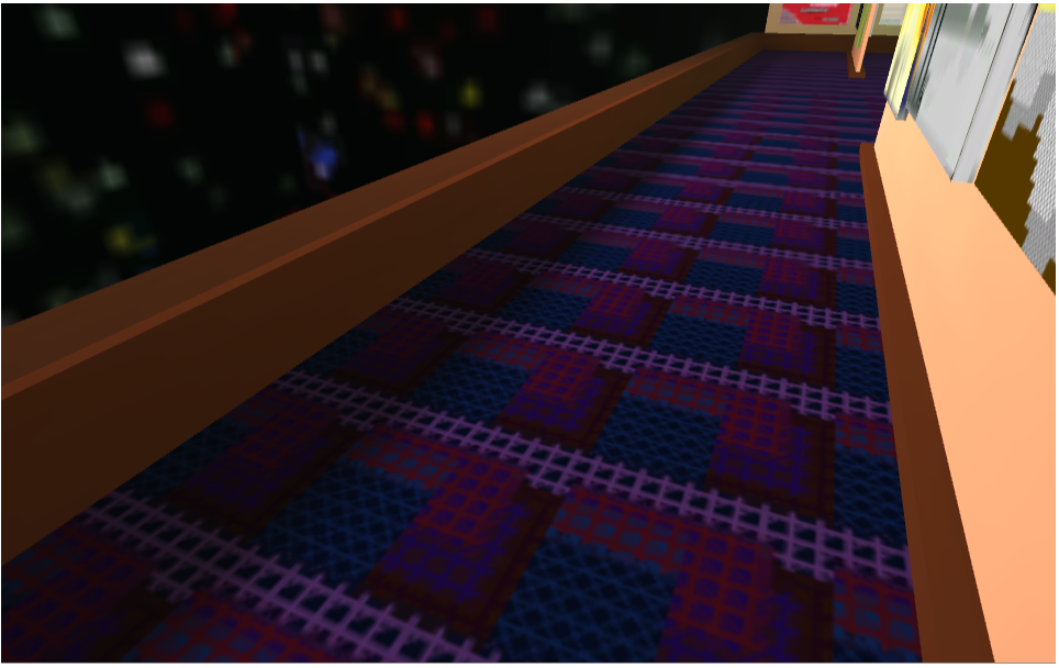 At some point I realized I needed carpeting. In continuing my strategy of operational simplicity, I took one of the pieces already in the assets folder, my abstract skyline, applied a tint to it and tiled it across the floor cube. The dark red-blue-purple pattern evoked in me memories of the local bowling alley and the miniature golf-arcade I spent time at as a child. It was kitschy and slightly nostalgic: perfect
